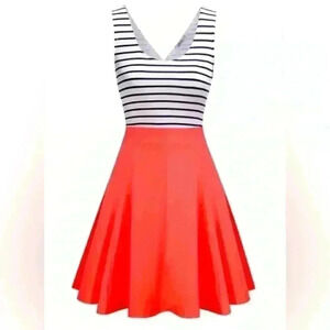 Missky Women Flowy Stripe Sleeveless Mini Summer Dress Stretch Top Size Small. Open back Black and White striped top with slight stretch. Zippered Red Coral non stretch attached skirt. Not lined.