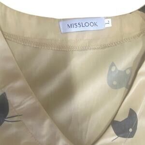 Misslook Cat Print Dress Beige Short Sleeve V-Neck Size L