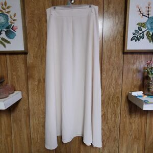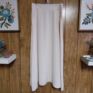 Beautiful cream colored maxi skirt with front pockets, back zipper, and belt loops. There is no size tag but the measurements are approximately a 14. Please read them before ordering to see if it's a good match for you. Materials tag just says cotton, but this is not a stretchy material, nor is it lined. Brand label has been cut on one side but I have left it for you to decide if you want to keep it or not, does not impact the skirt in any way. This would be a beautiful addition to a neutral wardrobe, could be worn casual or dressed up.