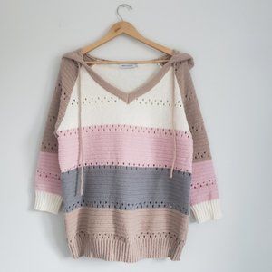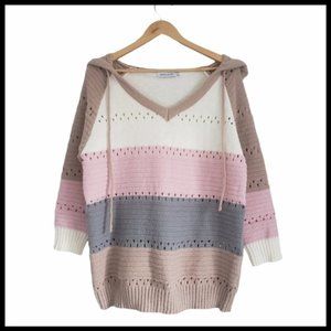 • Style: Vneck, hooded sweater with 3/4 length sleeves. Knit and eyelet pattern in a colourblock design. Ribbed neckline, cuffs and hem.