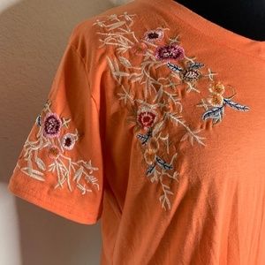 Misslook Orange T-Shirt With Colorful Embroidered Floral Detail Size XL . A slight v-neck. Gorgeous floral embroidery on chest and short sleeves. Has beautiful shimmery thread. Very soft and comfortable! Bright orange color!! Slightly longer in back. Measurements are approximate and taken while the item is lying flat... pit to pit.. 19".....bottom length 23"....top of shoulder to bottom hem in front..24".... top of shoulder to bottom hem in back.. 26".... Beautiful boho summer look!! Could even transition to fall with a cute scarf and boots!