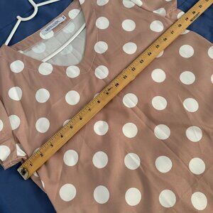 Adorable and comfy polka dot dress in soft blush pink with white dots. Features a flattering V-neckline, short sleeves, and a beautiful open-lace trim at the hem. Made of lightweight, breathable fabric — perfect for spring and summer!