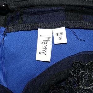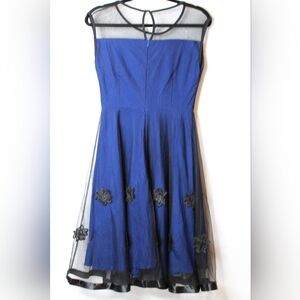 This stunning blue midi dress features a sleeveless A-line silhouette, ideal for wedding guests or cocktail occasions. The illusion neckline adds a sophisticated touch, while the black taffeta and floral accents create a striking contrast against the vibrant blue fabric.