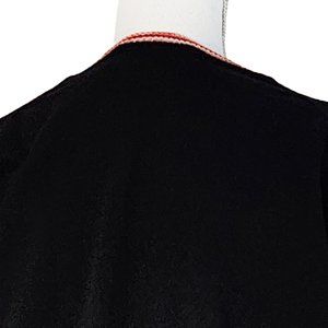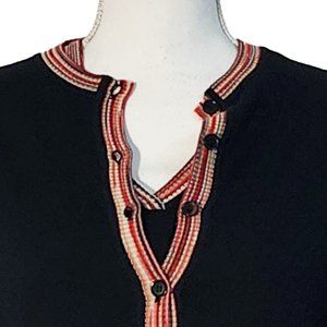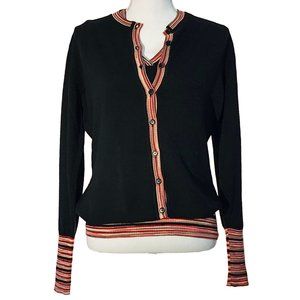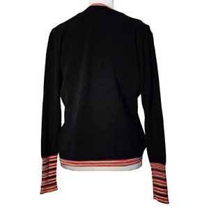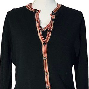 The cardigan is black with red, tan, and black stripes around the neckline, down the buttons, and at the ends of the sleeves. The sleeveless sweater is black and has the same stripes around the v-neckline and around the bottom.