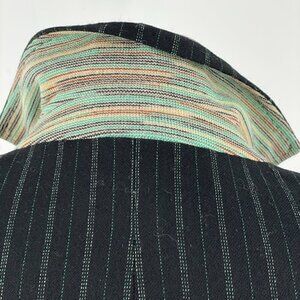 Wool with 2% stretch fitted, single breasted, notched collar two button career blazer in black with white chalk pinstripe. The lining is a contrast pattern that run through the sleeves which look great turned back. Under the collar and the pocket flaps are a traditional Missoni knit fabric in a contrast pattern.