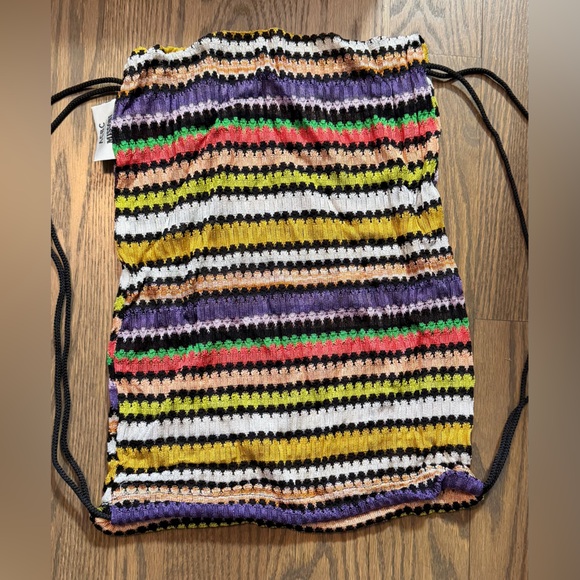 Chic and colorful drawstring backpack. Features stripes in purple, yellow, pink, green, and black. Perfect for adding flair to any outfit.