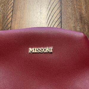Exterior is a soft red faux leather with Missoni logo plaque in gold-tone metal on the front.