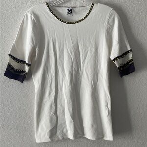 Elegant cream top featuring a striking yellow and purple neckline trim. Perfect for a chic look.