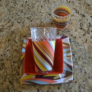 Missoni for Target Dinnerware - Service for 8 includes 8 highball glasses, 8 tall tumblers, 8 plates, and 8 bowls. Plates and bowls are melamine. Glasses are acrylic.