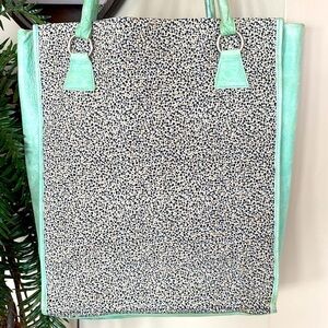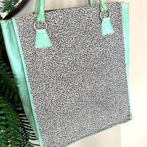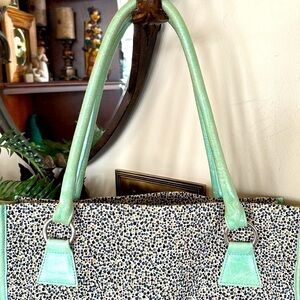 Stylish Missoni tote bag featuring a mint green leather and black multicolored dotted fabric. Made in Italy. Perfect for everyday use. Large enough for the office — carry a laptop, tablet, files and more.