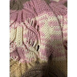 This pretty cardigan is from Missoni Italy in a misses size 8 US (Medium) Purple/pink, cream and brown. Made of 40% wool, 25% kid mohair, polymide, acrylic. Meant to be worn open, it has no fasteners. Does come with removable fabric tie belt. Hand washable.