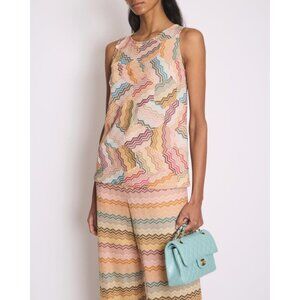 Get ready to turn heads in this stunning Missoni MARE top! Featuring the brand's iconic zigzag chevron knit, this sleeveless top is a true showstopper. The multicolored design is beautifully accented with shimmering metallic threads that catch the light with every move.