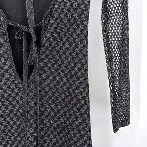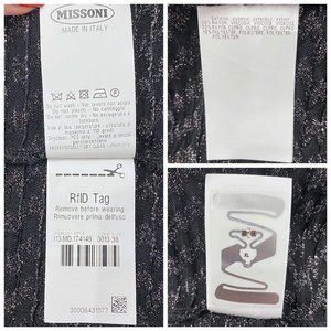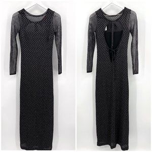 Black with iridescent silver metallic knit fitted slinky style long sleeve maxi dress with geometric pattern, by Missoni; size 38, US size 2, see size chart. Round neck, open tie back, mesh knit sleeves. Made in Italy