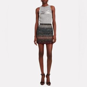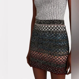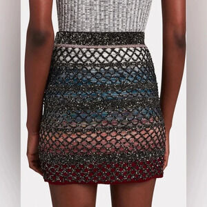 Overlayed in this season's glittery lurex cage knit, the Italian label's mini skirt is striped in a space-dyed knit. Elasticized waistband. Pull-on style.