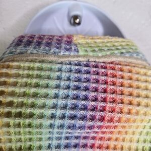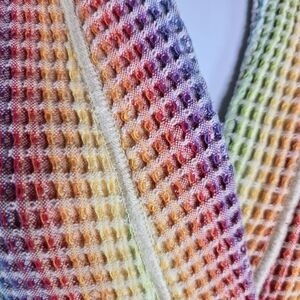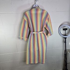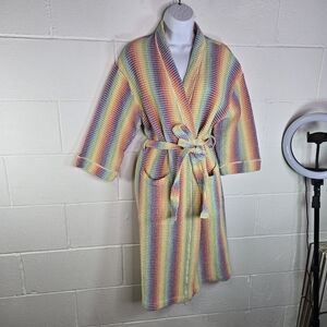 Vibrant multicolor robe. Features a striped pattern. Includes a matching belt. Perfect for lounging.