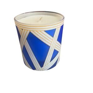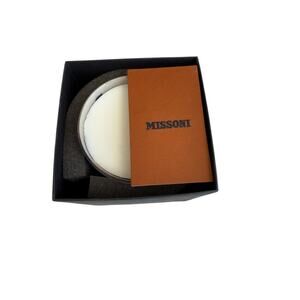 New Missoni Nastri Gift Boxed Candle. Taken from a series that completes Missoni's Nastri collection, this candle offers a fully sensorial experience. It's all contained in a fine bone china vessel decorated with Missoni's Nastri motif, in which orange and white bands are intertwined across a blue background. The candle emits a fresh and floral aroma with top notes of violet and anise, middle notes of cotton flower, and base notes of white musk and tonka bean. The 220g candle has a burn time of around 50 hours.