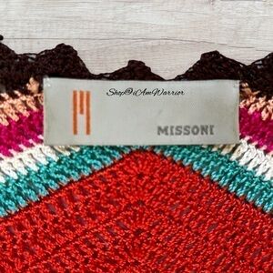 The piece features an open front with 3 fabric buttons around waistline, scalloped edges, and ¾ sleeves—hallmarks of Missoni’s mainline craftsmanship. Its drape and intricate texture make it a true statement layer.