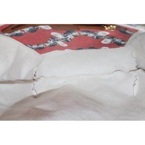 This is a fabulous, Missoni, canvas and leather, unique hobo style shoulder bag! It is made of canvas in red with a blue, grey, and white abstract seashell print and brown leather. It has a magnetic snap closure and a unique, heavy braided brown fabric cord as the strap with gold capped ends and gold loops on both sides it threads through and can be knotted to adjust the length.