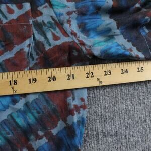 Pattern/Color: Abstract multicolor print with shades of blue, red, black, and gray