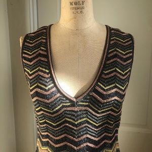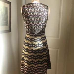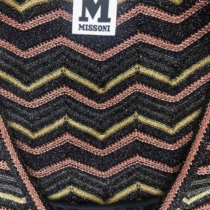 This is a beautiful dress by M Missoni. Trademark chevron pattern is in earthy tones and sparkles throughout. The cut is very flattering to most body types. This item is in excellent condition. Tag says size 42 - I would say US 2-4.