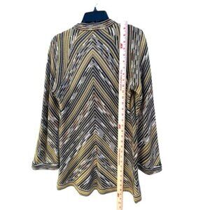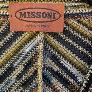 Iconic multicolored print pant and cardigan set by Missoni. Featuring a vibrant striped pattern in hues of black, olive, beige, and blue, with hints of gold shine, this set is a true statement piece. The long silhouette cardigan boasts a gold button front closure and two pockets for added functionality. The accompanying pants offer a comfortable fit with a 12.5" waist, 17.5" hips, and 31" inseam. Composition: 45% viscose; 23% cotton; 20% cupro; 12% polyester. Preowned and gently worn, this set is in excellent condition with no rips, stains, or snags.