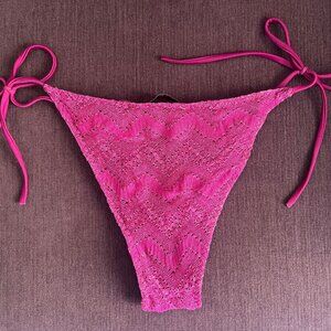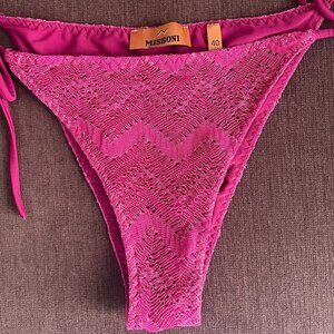 Purchased two months ago for $550 as part of a set from Missoni (still available online). Missoni lists the color as purple, but in person it’s more of a vibrant fuchsia with a beautiful metallic sheen. The cut is very flattering with just the right amount of coverage, and the fabric sparkles in the light. Worn only twice and in excellent condition. Selling because Missoni sells bikinis only as sets and I needed a different size bottom. It’s also a great mix-and-match bikini, I paired the top with other fuchsia bottoms and it looks wonderful.
