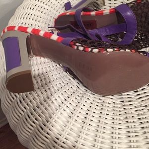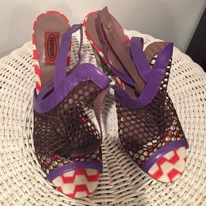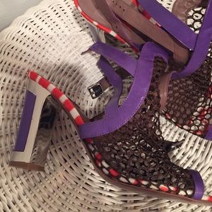 Purple leather and black mesh high heel sling backs with silver on heel.
