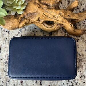 Zip-around travel/cosmetic case with signature zigzag design. Branded zipper pull and chevron lining. Measures 7.25” x 4.25” x 2” tall