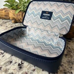 Zip-around travel/cosmetic case with signature zigzag design. Branded zipper pull and chevron lining.