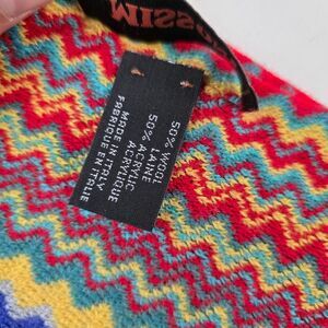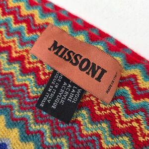 Add a bold pop of color to your cold-weather style with this authentic Missoni scarf, crafted in Italy. Featuring the brand’s iconic multicolor zigzag pattern in vibrant red, blue, yellow, black, and turquoise, this cozy accessory is finished with fringe edges for a playful touch. Made from a warm yet lightweight 50% wool and 50% acrylic blend.