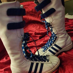 Vintage Missy Elliott Adidas boots with velcro straps, white and blue leather, great condition and a rare find in this condition