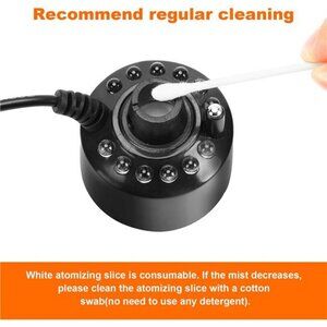 Atomizing slice is consumable, If the mist decreases, please clean the atomizing slice with a cotton swab. Always keep it clean!