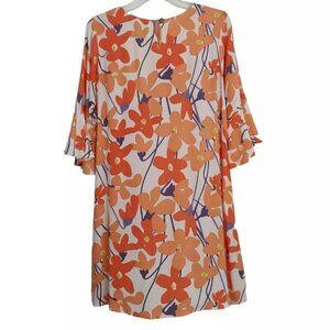 Mister Zimi Peggy dress in women's size 8. Orange floral print viscose fabric. Bell sleeves. Relaxed shift silhouette. Last model photo shown for style - print is different.
