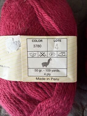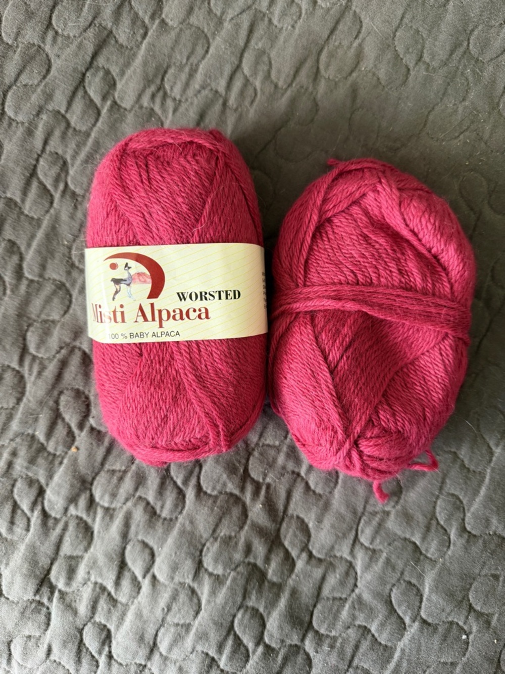 100% baby alpaca worsted weight yarn. Soft, plush texture. Rich deep raspberry pink color. 1 full skein and one half skein (no label)
