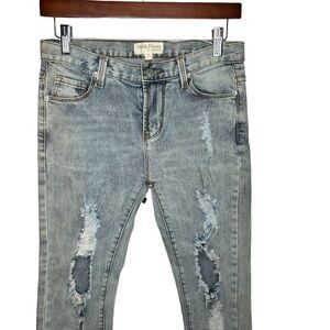 Mistic Prysm Women’s Destroyed Frayed Hem Jeans Size Medium Patina Blue Gray