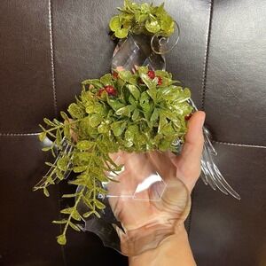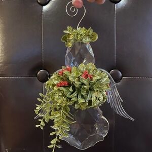 This preowned unique and beautiful Mistletoe Faceted Lucite Crystal Angel Ornament is excellent gentle used condition. It measures 9” tall. It is an Extra Large ornament that could be hung on a Christmas tree or under a doorway for a romantic touch. The wings and synthetic mistletoe holly are glued onto the huge lucite crystal. A delicate swirled silver hook trims the top for easy hanging.