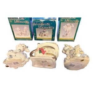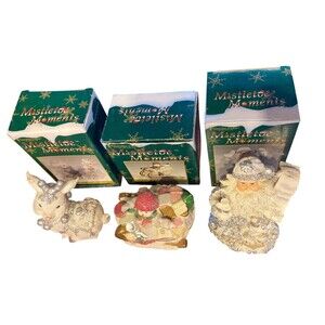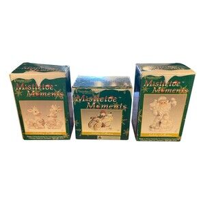 This is a lot of three vintage Cornerstone Creations Christmas figurines. They are part of the Mistletoe Moments Collection. They measure approx. between 4 and 5 tall. The reindeer has a brown spot on his ear. Please see photos for more details.