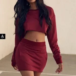 Feminine street wear vibes are here with 'Angel Cake'. Made from a soft sweatshirt jersey, 'Angel Cake' comprises a cropped relaxed fit sweatshirt with slightly wide neckline and a coordinating mini skirt. Ribbing to the cuffs and bands finishes the look and we love this teamed with mirror ankle boots.