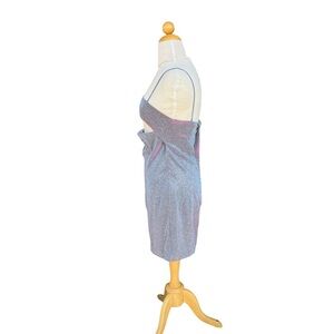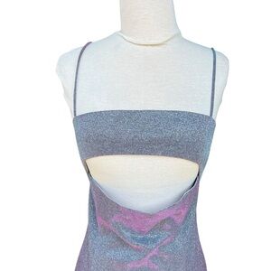 Mistress Rocks Creed Rainbow Lilac Sparkle Cutout Mini Dress. Women’s size large. Shimmery Silver, Purple and Pink sparkle in a bodycon mini style with spaghetti straps and a cutout under the bust. Zip closure at back, lined.