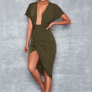 This striking green dress features an asymmetrical wrap design with a daring plunge neckline, perfect for a cocktail night out. The bodycon fit accentuates the silhouette, while the high-low hem and slit add a touch of elegance. Short Dolman sleeves complete the chic look.