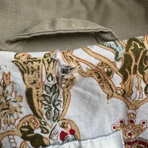 The coat includes a back hem slit for easy movement and padded shoulders for structure. It is fully lined with a distinctive patterned fabric, adding a unique touch. Made from a cotton and polyester blend, it is a perfect transitional piece for any wardrobe.
