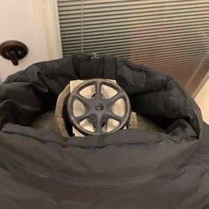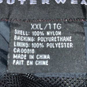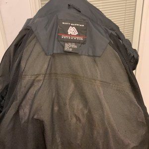 XXL. Misty mountain rain coat. Black reflective trim. Hood rolls into the collar. Two outer zipper pockets. Netted interior. Adjustable Velcro tighteners on the cuffs. Adjustable collar tie and waist band tie that the cord is a little damaged. GUC.