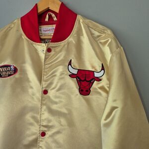 Gold satin long sleeve NBA Hardwood Classics Chicago Bulls 1996 NBA Finals snap up bomber jacket from Mitchell & Ness. Bull logo on the front of one side of jacket and NBA Finals 1996 on the other side. 2 outside pockets and 1 inside pocket. The inside of jacket is red satin with the bull logo.