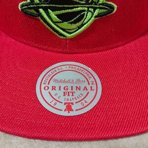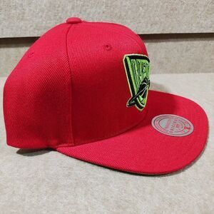 This vibrant adjustable snapback New Jersey Nets hat by Mitchell & Ness features a striking red base with a bold green logo, perfect for adding a sporty touch to any outfit. The flat brim and classic structured design make it a standout accessory for fans and fashion enthusiasts alike.