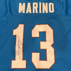 Mitchell & Ness NFL Throwbacks 1983 Dan Marino jersey, size XXL (56) for sale. This jersey features all embroidered numbers and letters and also an embroidered signature from Marino. Has a small hole on the front and a small stain on the back but otherwise excellent condition. Perfect for any fan of the dolphins!