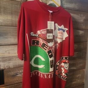 Bold red tee with Cincinnati Reds graphics. Features team logo and anniversary design. Perfect for baseball fans.