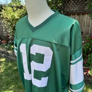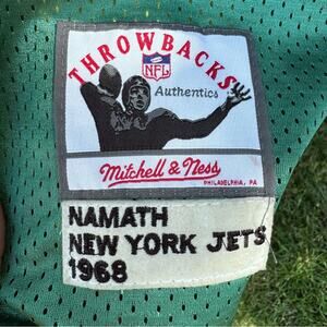 Mitchell & Ness Throwback 1968 New York Jets Joe Namath Jersey Size 54. In good preowned condition. Has some light pilling and snagging here and there. Has a some spots on the numbers. Measurements are approximate taken flat. Please see photos that show pit to pit as I measured higher and lower do to design cut