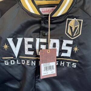Show your team pride in this lightweight satin bomber-style jacket by Mitchell & Ness, featuring the Vegas Golden Knights embroidered logo and lettering across the chest. Classic varsity details with black, gold, and white striped trim at the collar, cuffs, and hem. Snap front closure with front welt pockets. New with tags. Original retail $120. UPC: 196294524602.