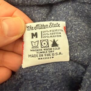 Mitten State Hoodie in size medium. The sweatshirt is pre-owned and there are no stains or rips. Minor wear/pilling. The sweatshirt has a purposefully distressed. It is a slub heathered navy material.