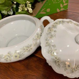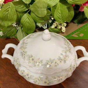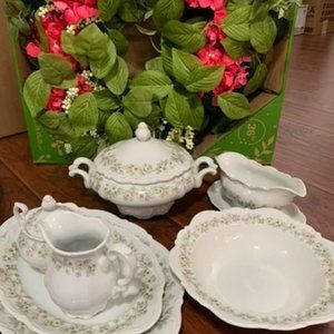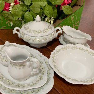 Soup tureen with lid, sugar bowl with lid, a creamer, 10" salad bowl, Gravy boat.
